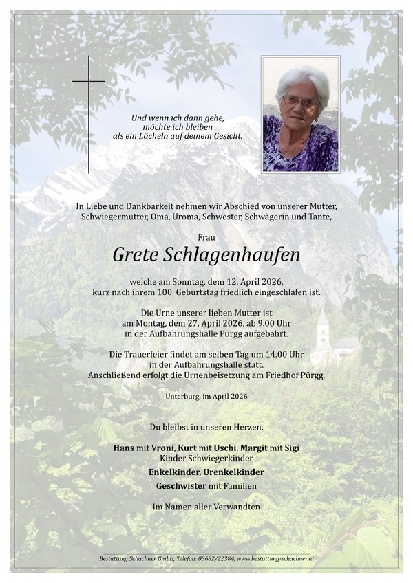 Aufbahrung der Urne am Montag, dem 27.4.2026 ab 9.00 Uhr in der Aufbahrungshalle Pürgg. Trauerfeier am selben Tag um 14 Uhr in der Aufbahrungshalle, anschließend Urnenbeisetzung am Friedhof.